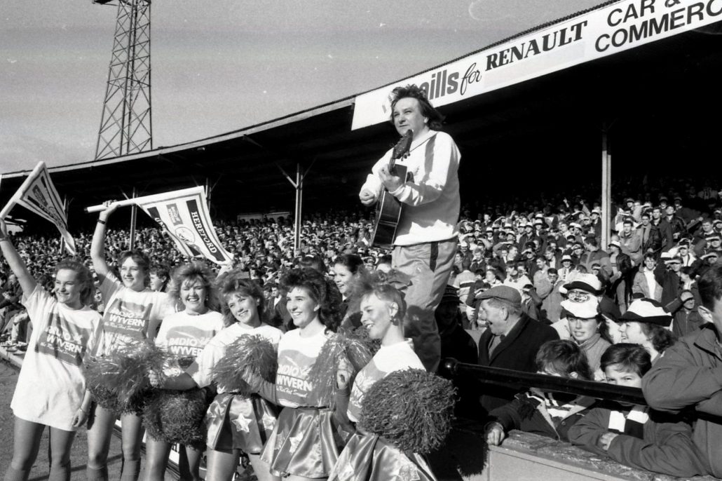 Six Fabulous Wyvern Cheerleaders with Danny Lee ( A great supporter of Wyvern and charity fundraiser walking miles with a pint of beer on his head ) at Hereford United V Manchester United